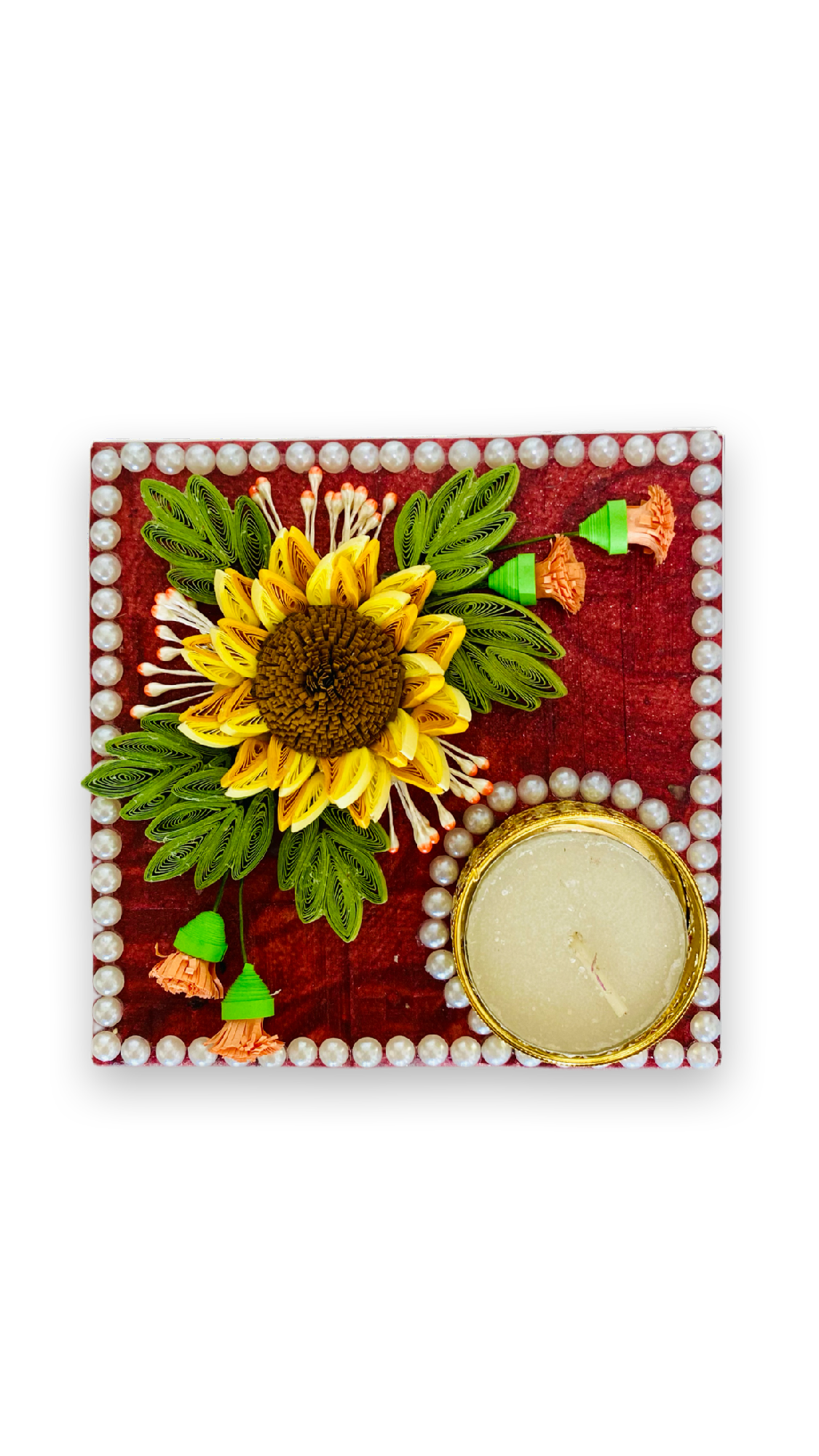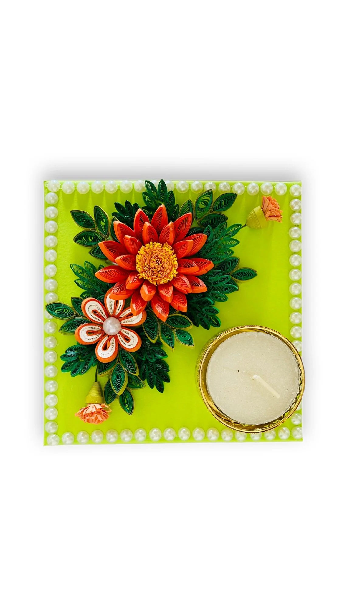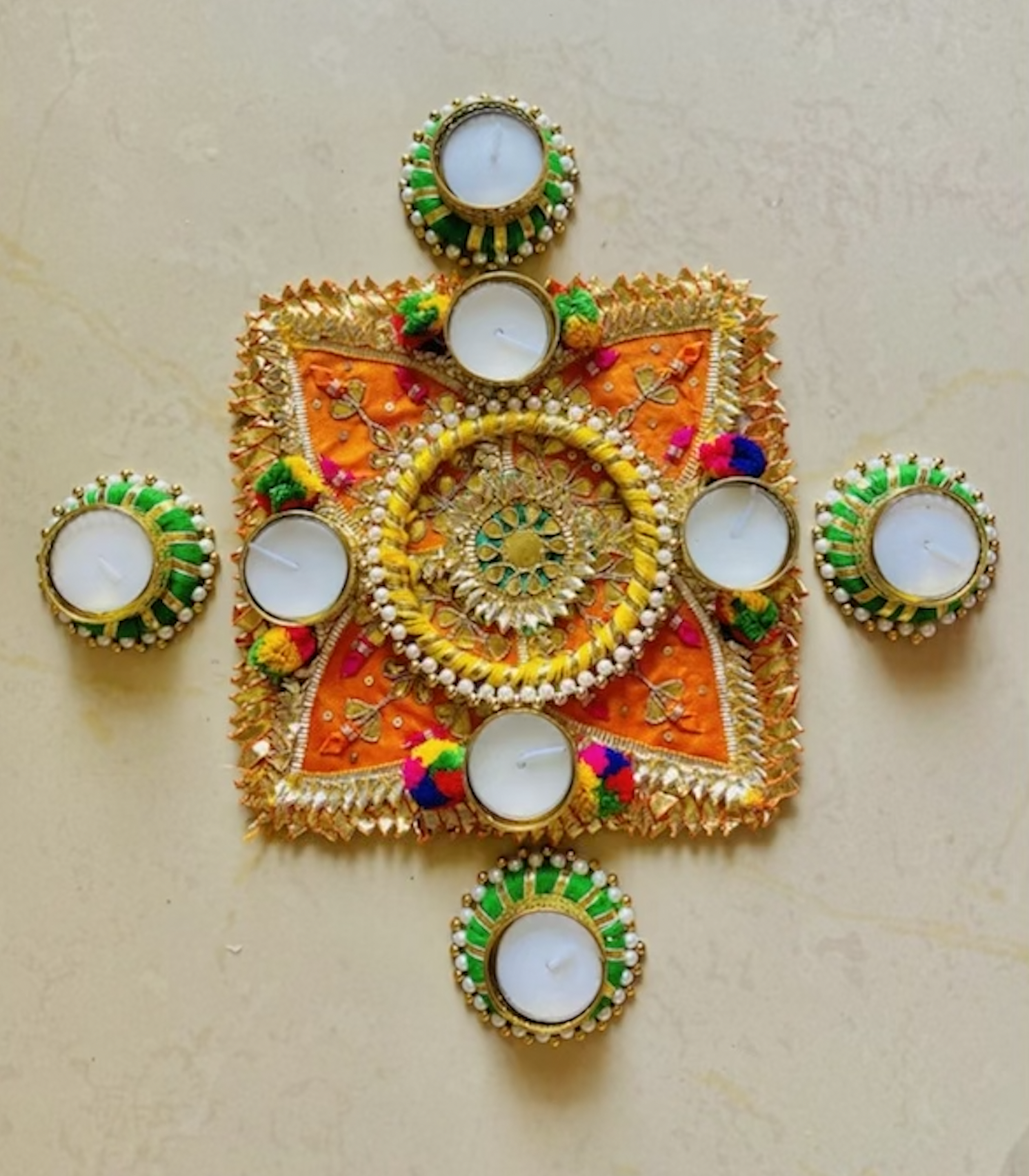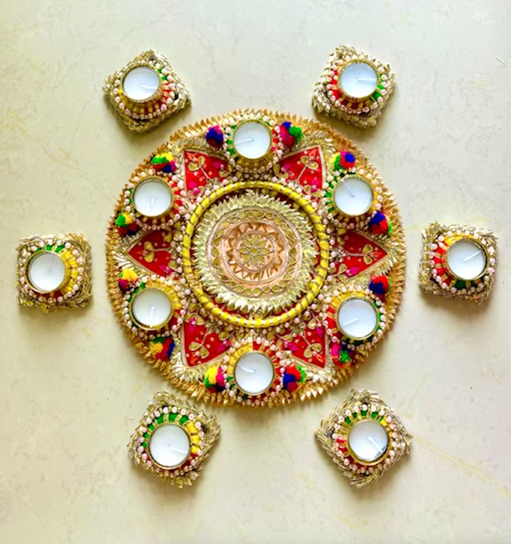Size 8 inches x 8 inches for the center piece + extra Diyas on the side