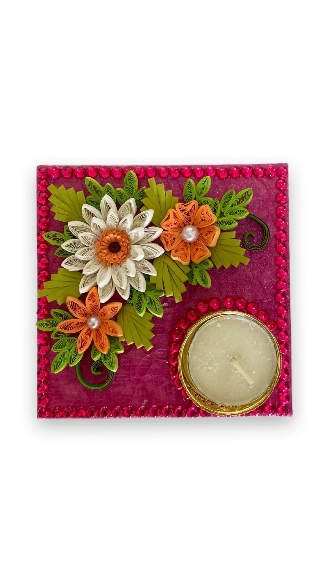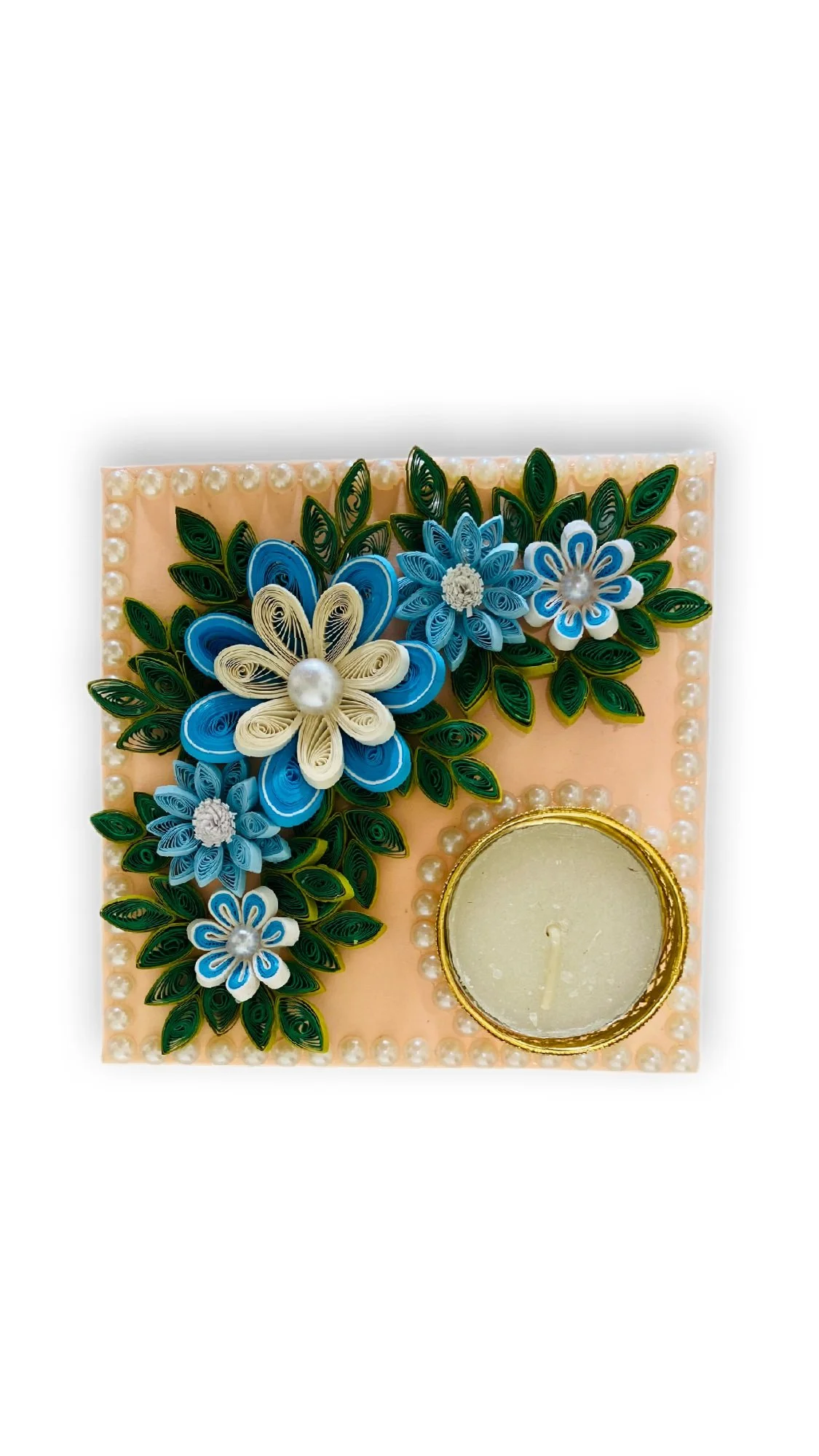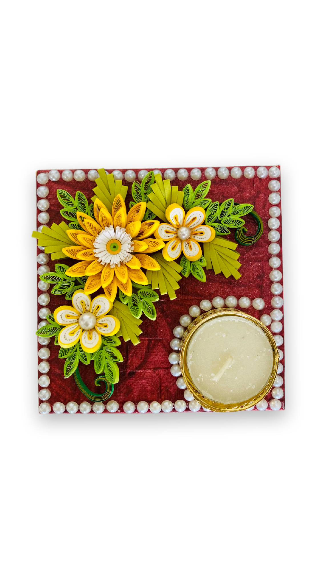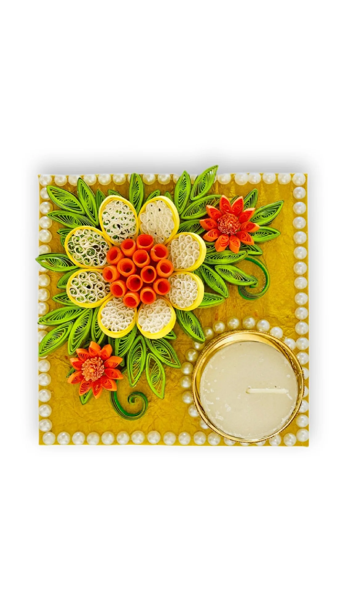 Size 8 inches x 8 inches for the center piece + extra Diyas on the side