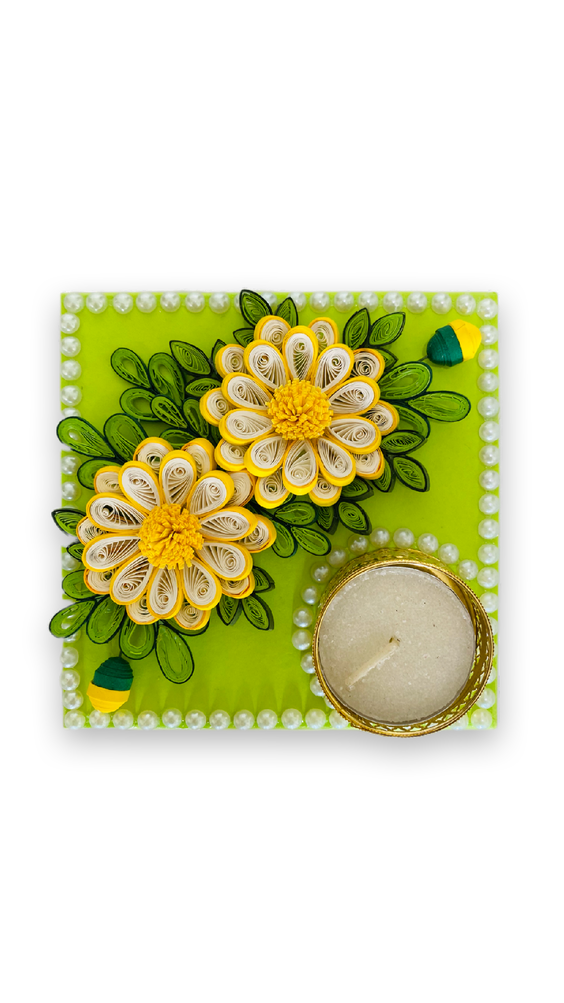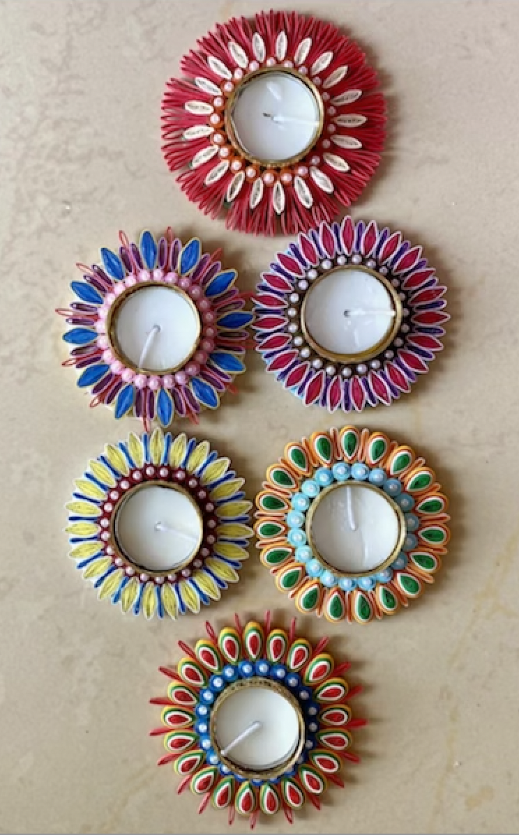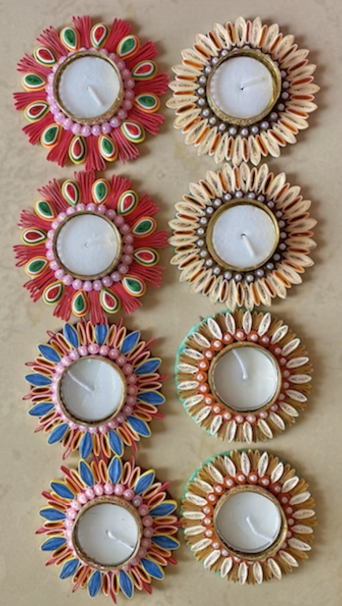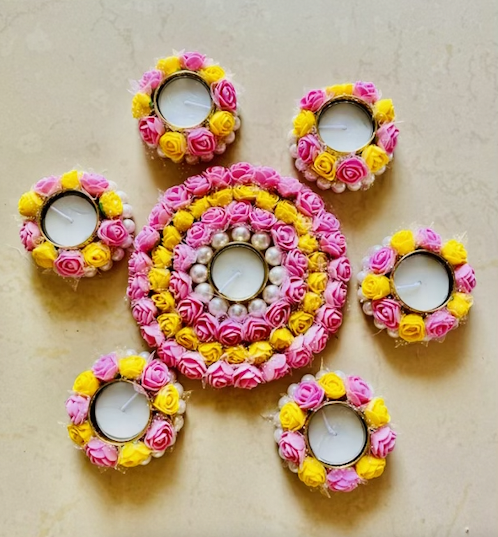 Size 8 inches x 8 inches for the center piece + extra Diyas on the side